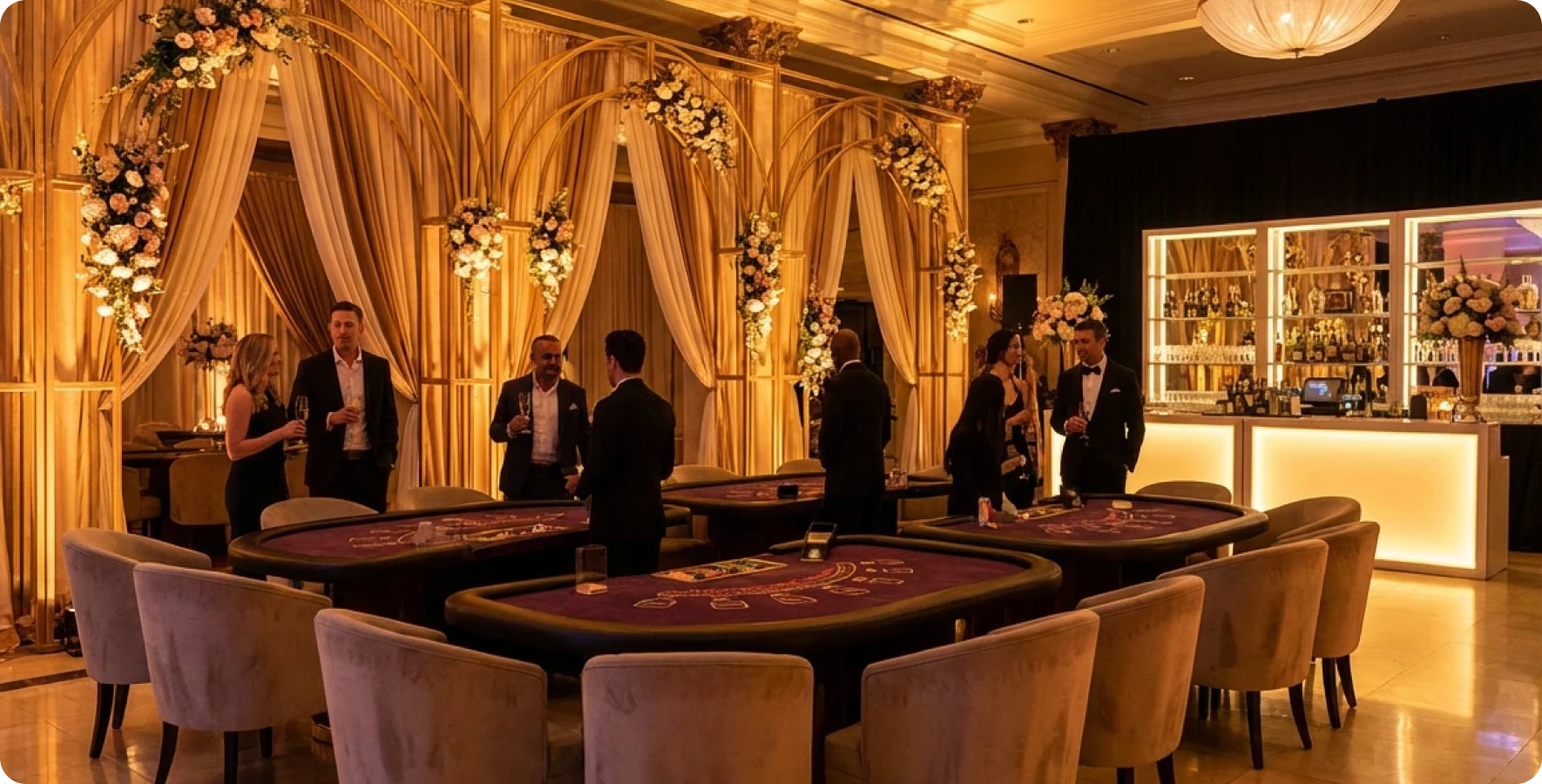 Turn your venue into a casino wonderland with details that make every corner feel intentional. We provide all the essentials — from elegant glassware and poker chips to ambient lighting, decorative arches, and stylish seating. Every item is chosen to create a cohesive, immersive atmosphere. Mix, match, and layer elements to reflect your style and the mood you want for your event. With the right combination, your party won’t just be an evening — it will be a fully themed experience that guests remember long after the last game ends.